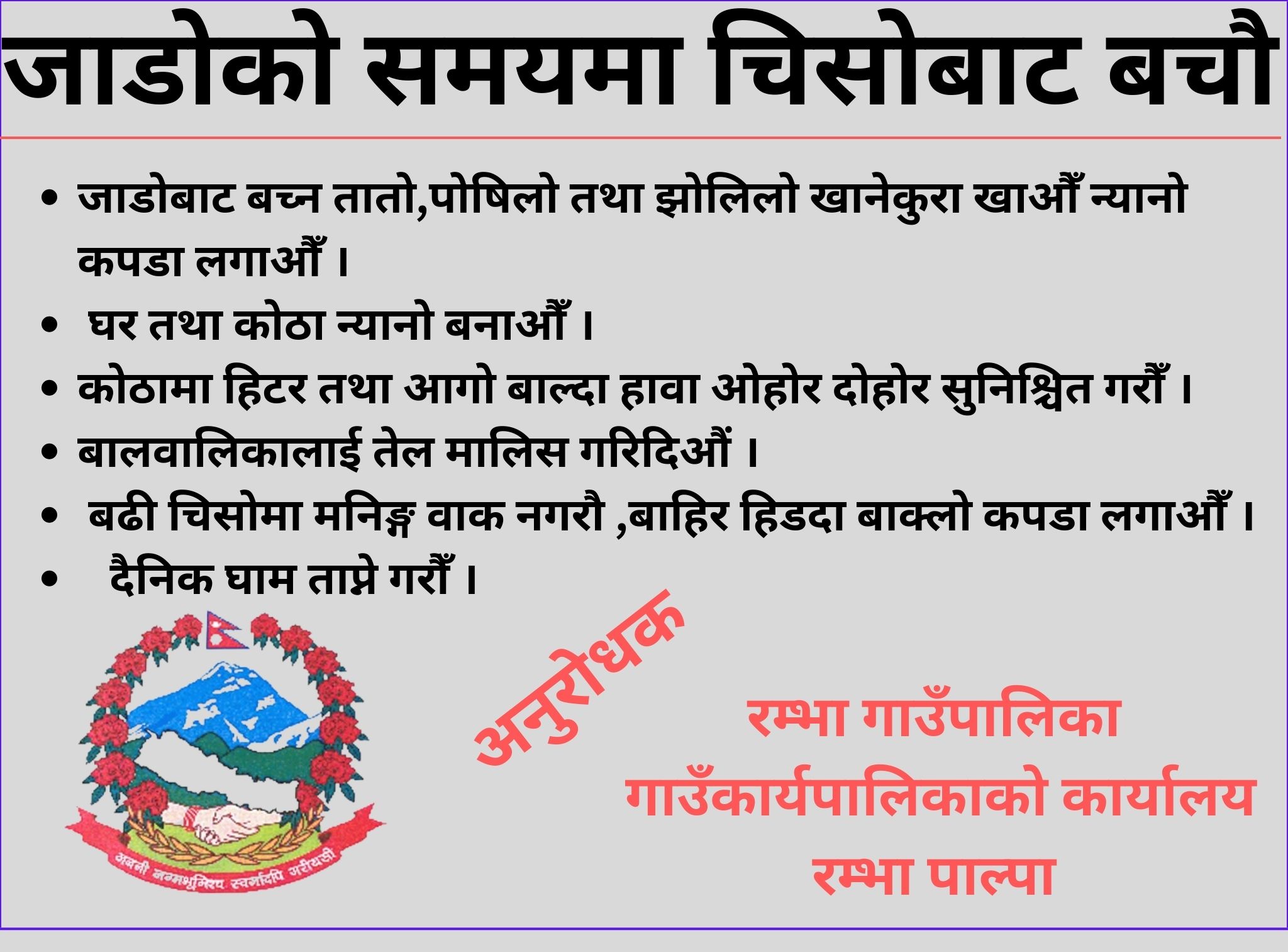 पाल्पा, अन्धकारमुक्ति बचत तथा ऋण सहकारी संस्था रामपुर पाल्पाले रामपुर अस्पताल संगै इलाका प्रहरी कार्यालयलाई न्यानो कपडा प्रदान गरेको छ । सहकारीले स्थापना दिवसको अवसरमा शनिबार अस्पतालको वेड र प्रहरी कार्यालयको हिरासत कक्षको लागि बलाङ्केट वितरण गरेको हो ।